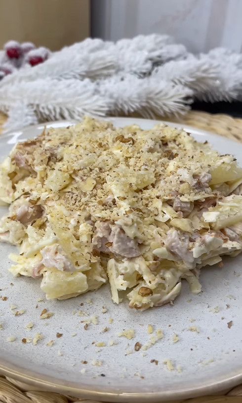 Приготування цього салату докладно описано у блозі @vistovska_cooking. Вам знадобляться 2 курячі стегна, 200 г консервованих ананасів і 150 г копченого сиру. Заправляють його майонезом, додаючи сіль та перець за смаком.
