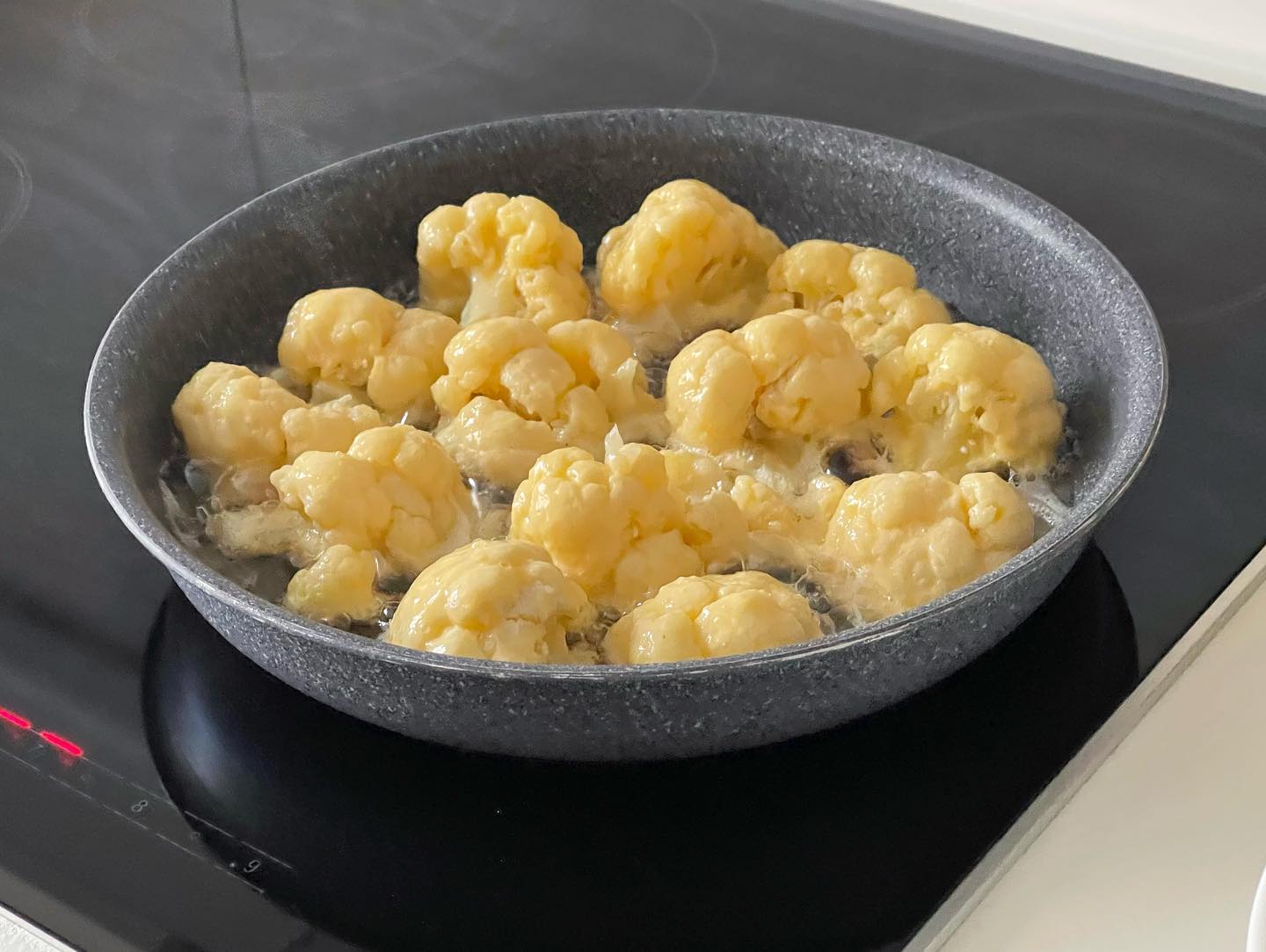 Відварену цвітну капусту опускаємо в кляр, потім виймаємо виделкою з кляру і відправляємо смажити в сковороду до золотистої скоринки.