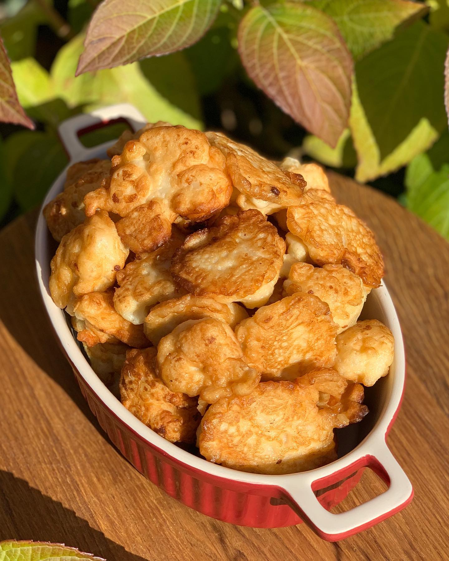 Інгредієнти: цвітна капуста (2/3 шт.), яйця (2 шт.), сметана (5 ст. л.), молоко (3 ст. л.), борошно (4,5 ст. л. з невеликою гіркою), сіль, перець, паприка, сухий або свіжий часник, рослинна олія (200 мл).
