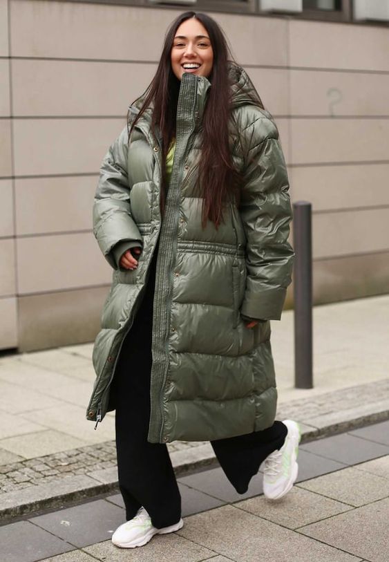 Артистка обрала для морозної погоди довгий пуховик – один із головних трендів зими 2022/23. У парі з широкими джинсами сірого кольору чорна куртка виглядає неймовірно стильно. А завдяки молочному светру на блискавці та кросівкам на зеленій підошві образ вийшов ненудним, незважаючи на те, що в ансамблі переважають темні відтінки.
