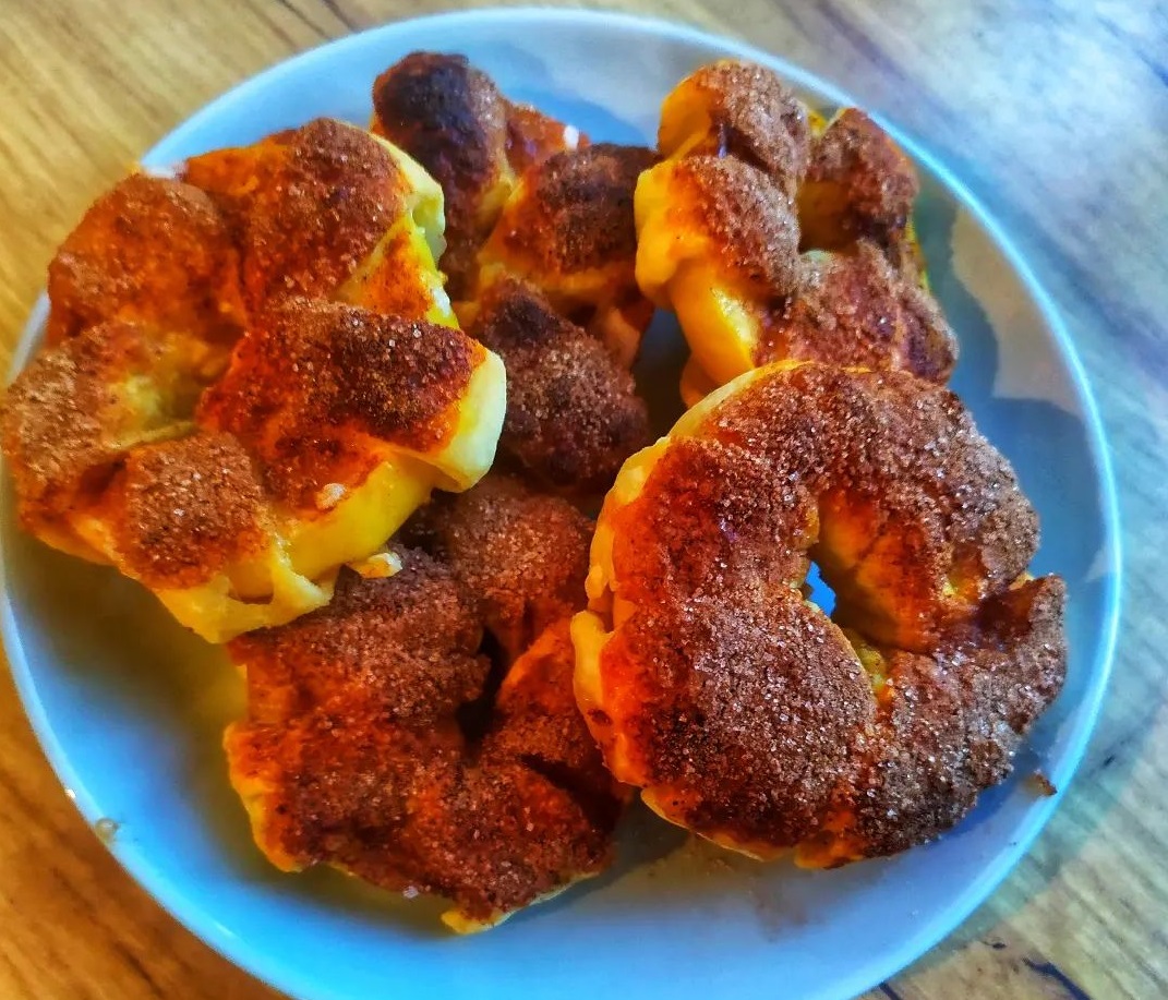 В окремій мисці змішуємо цукор з корицею і занурюємо у суміш яблучні кільця.
