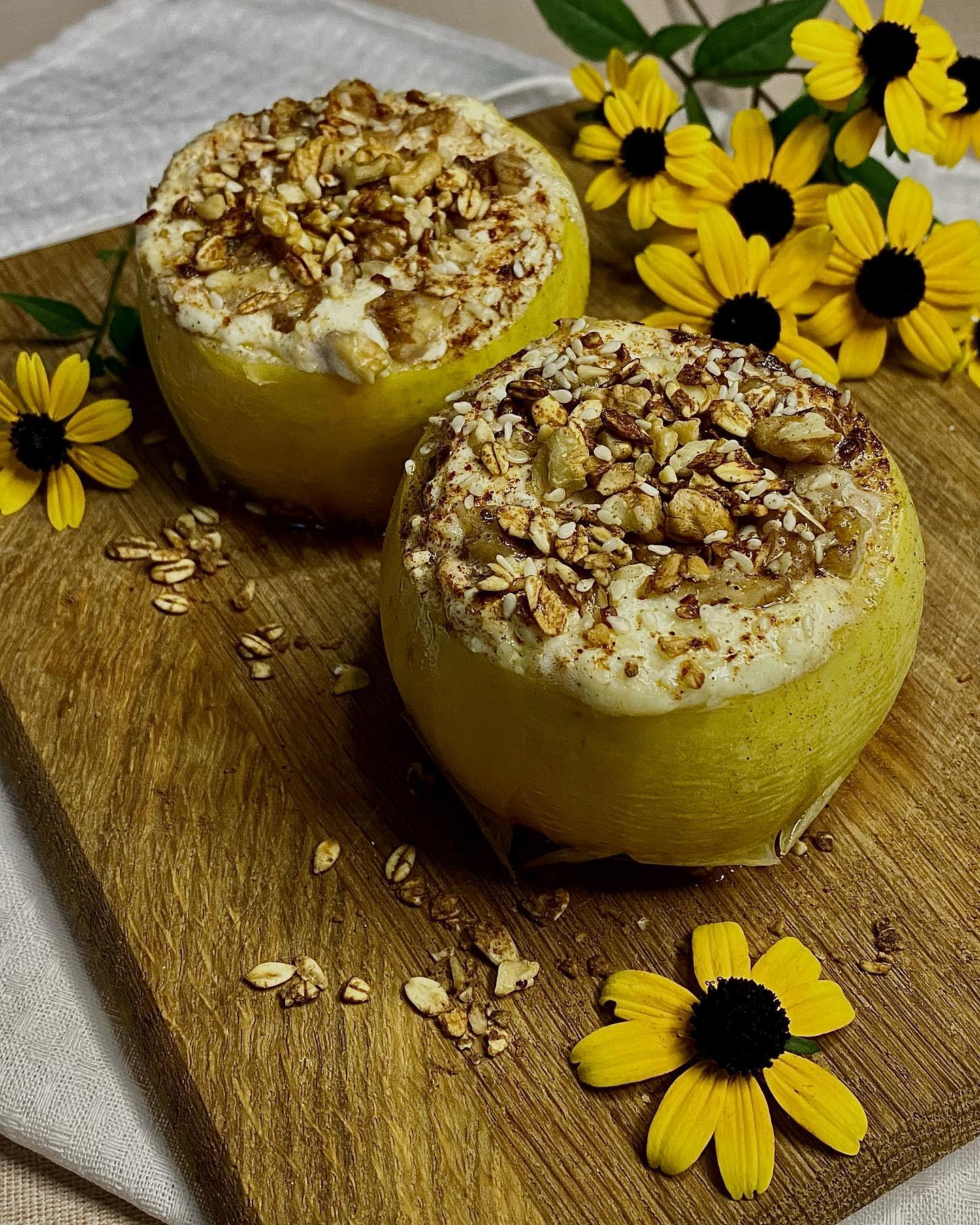 Інгредієнти: великі яблука (4 шт.), сирна маса або кисломолочний сир (350 г), вершкове масло (30 г), волоський горіх, кориця, кунжут, мед.