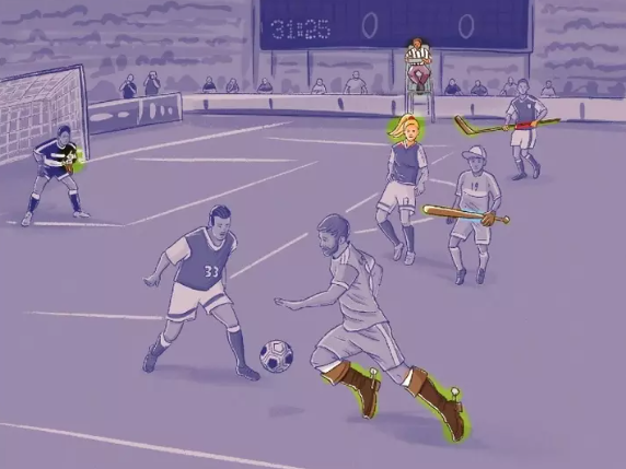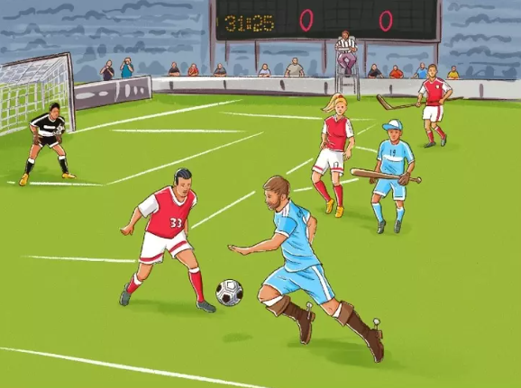 На картинці зображено футбольний матч і, здається, гра у самому розпалі - гравці бігають по всьому полю, а за них вболіває величезна аудиторія.