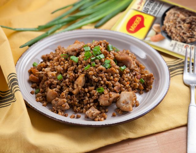 Курку потрібно відварити або посмажити на невеликій кількості олії. Потім дати їй трохи охолонути і нарізати на невеликі шматочки. Додати курку в гречану кашу. Потім додати спеції і заправити страву рослинним маслом.