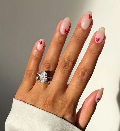 Такий манікюр буде виглядати максимально ніжно та жіночно. Головна деталь – маленькі червоні серця, які майстер малює на кожному нігтику.