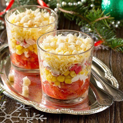 Викладаємо шарами: помідори, майонез, кукурудза, крабові палички, майонез, сир, сухарики.