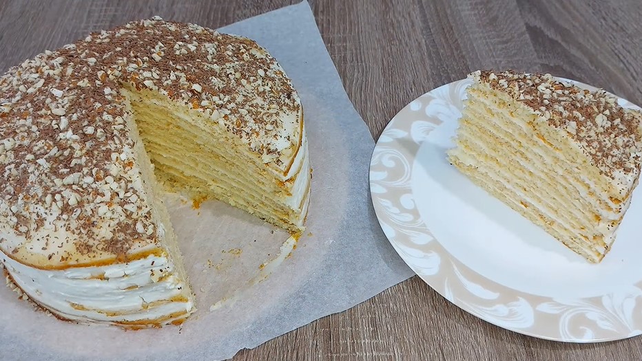 Інгредієнти: 600 г сирого згущеного молока, 3 яйця, 45 г масла, 240 г борошна, 1,5 ст л розпушувача. Для крему: 900 г сметани (краще вищої жирності), цукрова пудра за смаком , 2 пакетика згущувача для сметани.