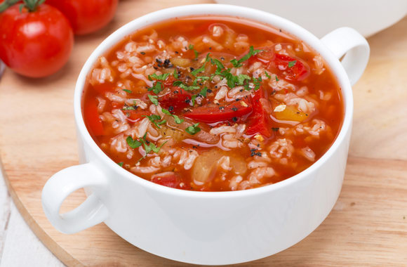 І третій варіант швидкого та корисного супу: цибуля, солодкий перець, томатна паста (близько 2 столових ложок), відварений рис, зелена цибуля і зелень для прикраси. Цибулю і солодкий перець помити, почистити і нарізати. Обсмажити на сковороді 5 хвилин, потім покласти в киплячу воду. Додати томатну пасту, сіль і перець за смаком. Коли овочі зваряться, додати в суп заздалегідь відварений рис, прикрасити дрібно нарізаною зеленню і зеленою цибулею.