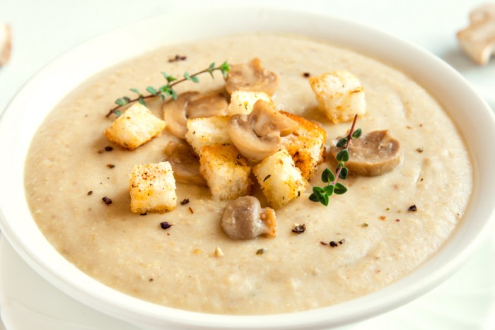Продукти для другого варіанту: печериці, цибуля, плавлені сирки (кілька штук), сухарики. Гриби і цибулю потрібно помити, почистити і нарізати на маленькі шматочки. Потім обсмажити на сковороді 5 хвилин. Після чого відправити в киплячу воду на 10 хвилин. Тепер потрібно додати дрібно нарізані плавлені сирки і подрібнити суп блендером до стану однорідного пюре. Перед подачею прикрасити сухариками.
