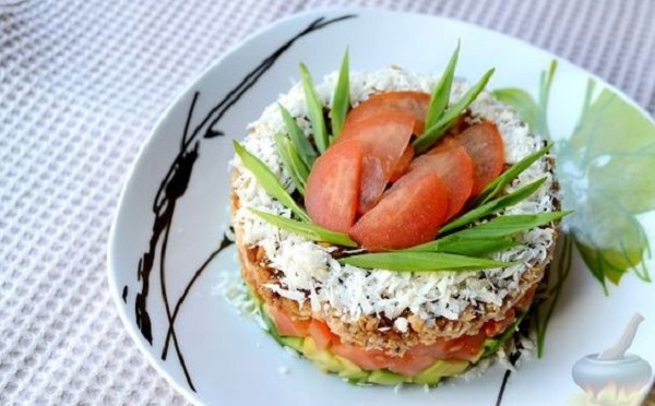 - Багатошаровий салат з авокадо, помідорами і горбушею