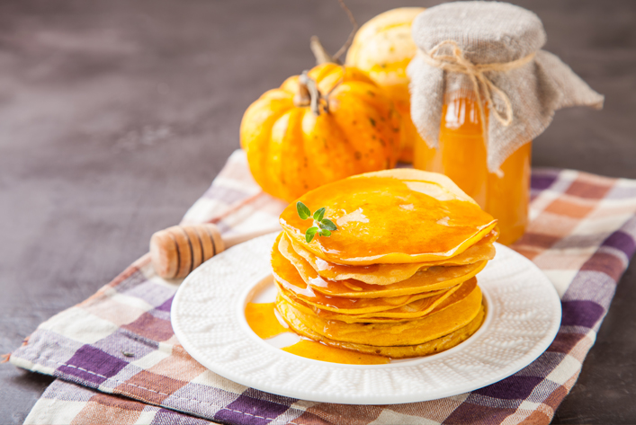 Подаємо апетитні гарбузові панкейки з джемом, медом або згущеним молоком.