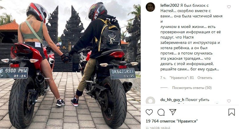 "Я був близький з Настею [...] Є перевірена інформація від її подруг, що Настя завагітніла від інструктора і хотіла дитину, а він був проти. Потім трапиласяця жахлива трагедія. Що робити з цією інформацією, вирішуйте самі. Бог йому суддя", - написав користувач без будь-якої особистої інформації в обліковому записі.