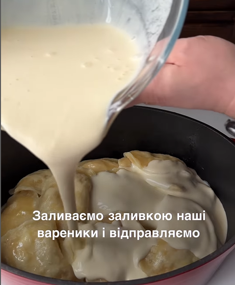 5. Для заливки змішуємо сметану з яйцем, додаємо сіль, цукор, ваніль чи цедру - за смаком. "У мене на цю кількість вареників пішла подвійна порція заливки, хотілось покрити їх повністю", - додала блогерка.