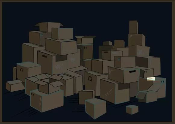 На картинці зображено величезну купу коробок, які стоять на підлозі у вітальні. Здається, хтось переїжджає. Але якими уважними не були господарі коробок, вони кудись поклали ключ від будинку і тепер не можуть його знайти.