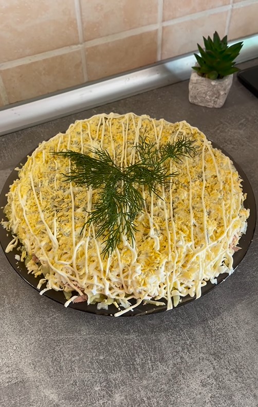 Наступний шар - маринована цибуля, потім знову все поливаємо майонезом, далі беремо плавлений сир, зверху ще трішки майонезу. Два крайніх шари: білок – майонез – жовток (цей шар ми не поливаємо майонезом). За бажання прикрашаємо наш салат гілочкою зелені. Даємо страві кілька годин настоятися у холодильнику, щоб смак сповна розкрився і став таким, як потрібно, і насолоджуємося ніжним салатом.
