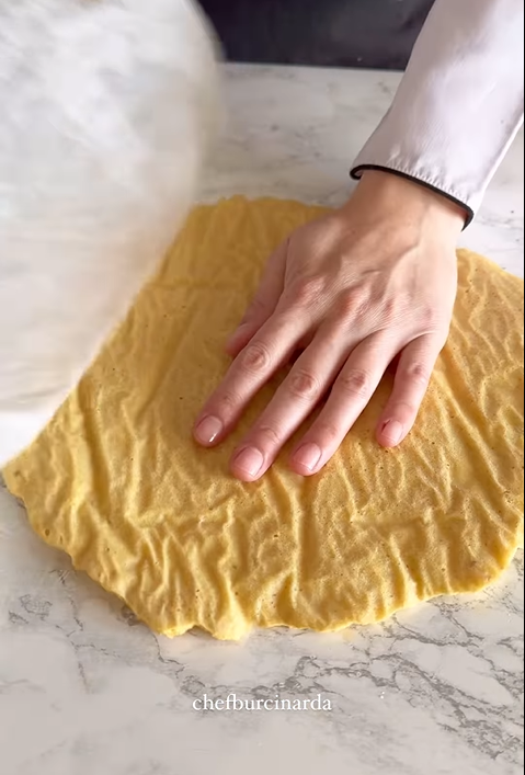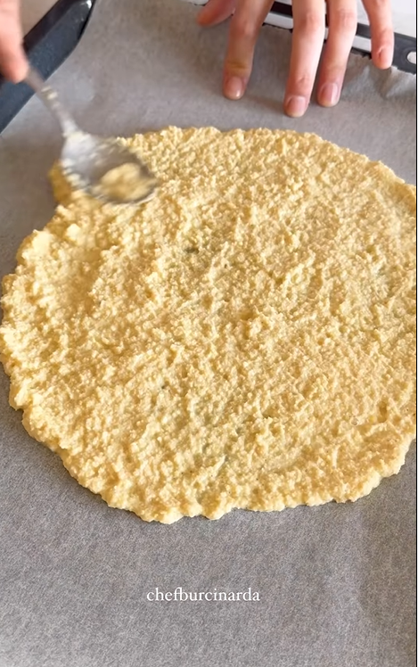 "Нут, який ви тримали у воді всю ніч, посоліть і перебийте у блендері, щоб він був не дуже рідким і не надто твердим. Масу з нуту розділіть на дві порції і викладіть на пергаментний папір у формі тонкого круга, а потім відправте до розігрітої духовки. Випікайте коржі при температурі 190 градусів протягом 15 хвилин", - розповіла Burçin Arda.
