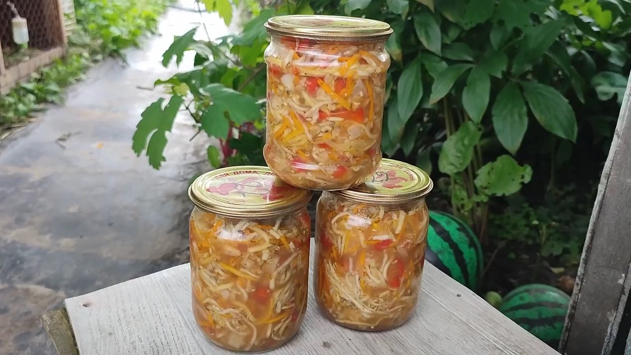 Інгредієнти: 3 кг кабачків , 0,5 кг моркви, 0,5 кг цибулі, 3-5 штук червоного солодкого перцю, 1 головка часнику, 1 пачка приправи для корейської моркви (30 г), 1 стакан оцту 9% (об'ємом 250 мл), 2/3 стакани соняшникової олії (об'ємом 250 мл), 1 стакан цукру (об'ємом 250 мл), 2 столові ложки солі, пучок кропу. Пропорції вказані для приготування 9 баночок об"ємом півлітра.