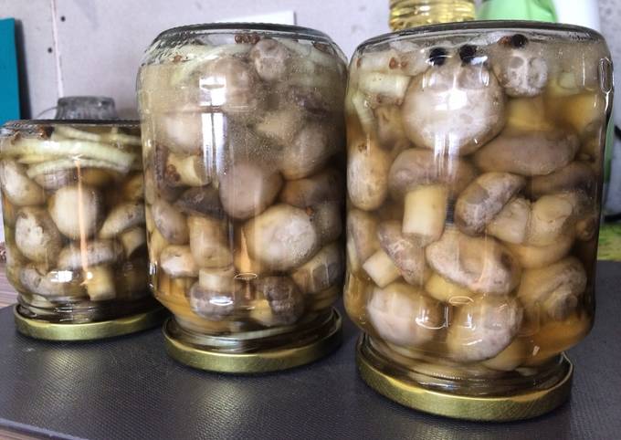 Інгредієнти: печериці (1,5 кг), вода (1 л), рослинна олія (250 мл), оцет 6% (150 мл), часник (25 г), сіль (20 г), цукор (20 г), лавровий лист (4 шт.), перець горошком (10 шт.), запашний перець (10 шт.), сухі спеції (за смаком).