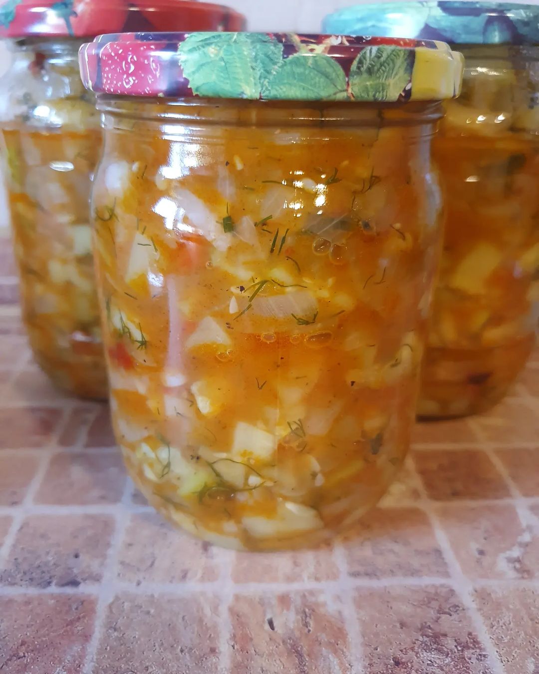 Інгредієнти: кабачки (1 кг), морква (0,5 кг), цибуля (700 г), часник (1 головка), кріп (пучок), томатна паста (150 г), олія (100 мл), цукор (50 г), сіль (25 г), оцет 9% (3 ст.л.).