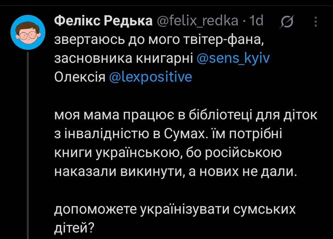 "Ви можете не знати, але в Твітері вже кілька днів несеться історія з бібліотеками і державним забезпеченням оних. Я вагався, чи виносити цю історію сюди, чи ні. Виношу, бо вона важлива зразу з кількох причин. Плюс усі причетні – люди публічні, ця розмова теж відбувалась публічно і навряд чи я комусь зіпсую репутацію (більше ніж вони самі собі). Почалося з того, що Фелікс Редька написав твіт на першому скріні. Що саме його спонукало – я не знаю і він не каже. Прекрасного в ньому багато. В першу чергу те, що в Сумах немає бібліотеки "для діток з інвалідністю". Там є інклюзивна бібліотека, при чому не суто дитяча. Як резонно зазначала пані Інна Ковалишена (здається) – діти з інвалідністю не потребують окремої бібліотеки, а потребують нормального доступу до наявних", - розповів письменник.
