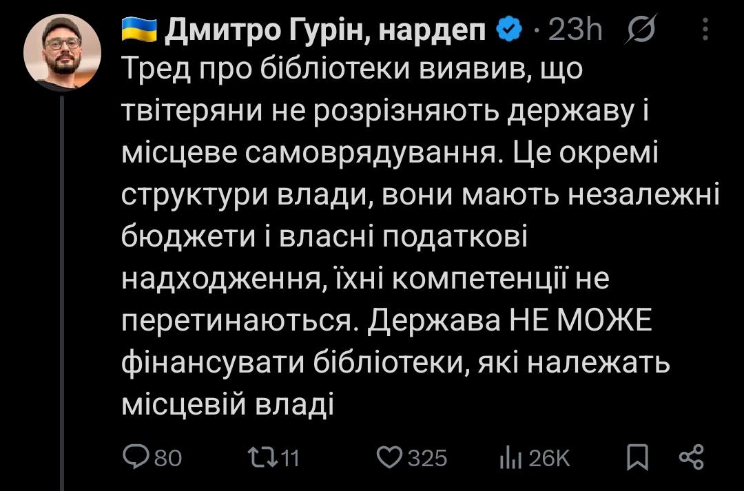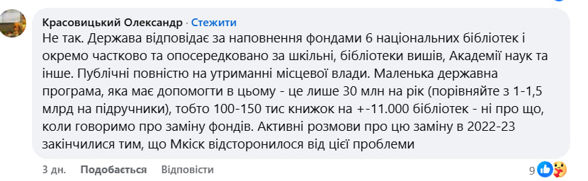 "Не так. Держава відповідає за наповнення фондами 6 національних бібліотек і окремо частково та опосередковано за шкільні, бібліотеки вишів, Академії наук та інше. Публічні повністю на утриманні місцевої влади. Маленька державна програма, яка має допомогти в цьому - це лише 30 млн на рік (порівняйте з 1-1,5 млрд на підручники), тобто 100-150 тис книжок на +-11.000 бібліотек - ні про що, коли говоримо про заміну фондів. Активні розмови про цю заміну в 2022-23 закінчилися тим, що Мкіск відсторонилося від цієї проблеми", – написав в коментарях Красовицький.