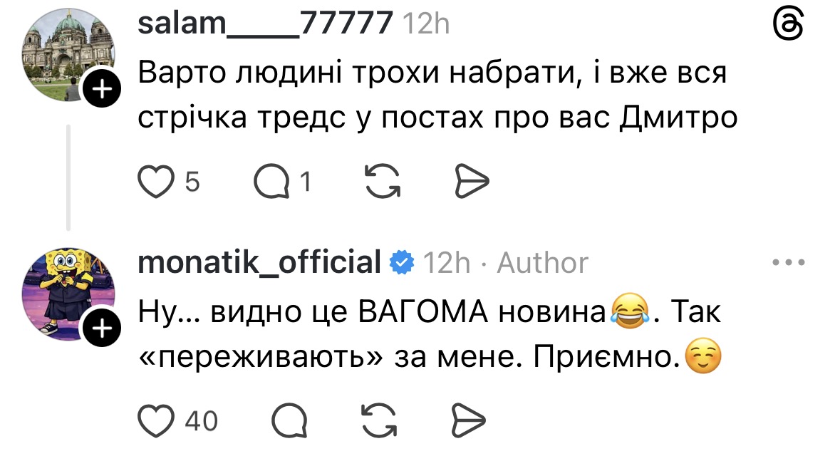 Монатік відповів і на це: "Ну... видно, це вагома новина... Так "переживають" за мене. Приємно".