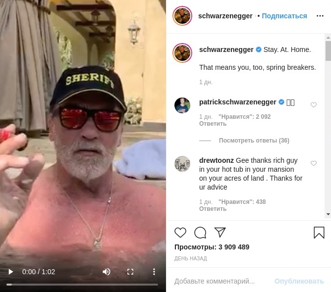 "Я вдома, приймаю джакузі, курю сигару, - сказав колишній губернатор Каліфорнії. - Тільки-но закінчив велосипедну прогулянку і трохи потренувався, просто продовжую сидіти вдома, далеко від натовпу. Кажу це, бо бачив безліч фото і відео, на яких люди по всьому світу сидять в кафе, проводять час в людних місцях. Це нерозумно, тому що так ви можете підхопити вірус. Так ви і заражаєтеся, через контакт з іншими людьми. Тому тримайтеся подалі від натовпу, не ходіть в ресторани і кафе, вирушайте додому. Так ми зможемо вирішити цю проблему".