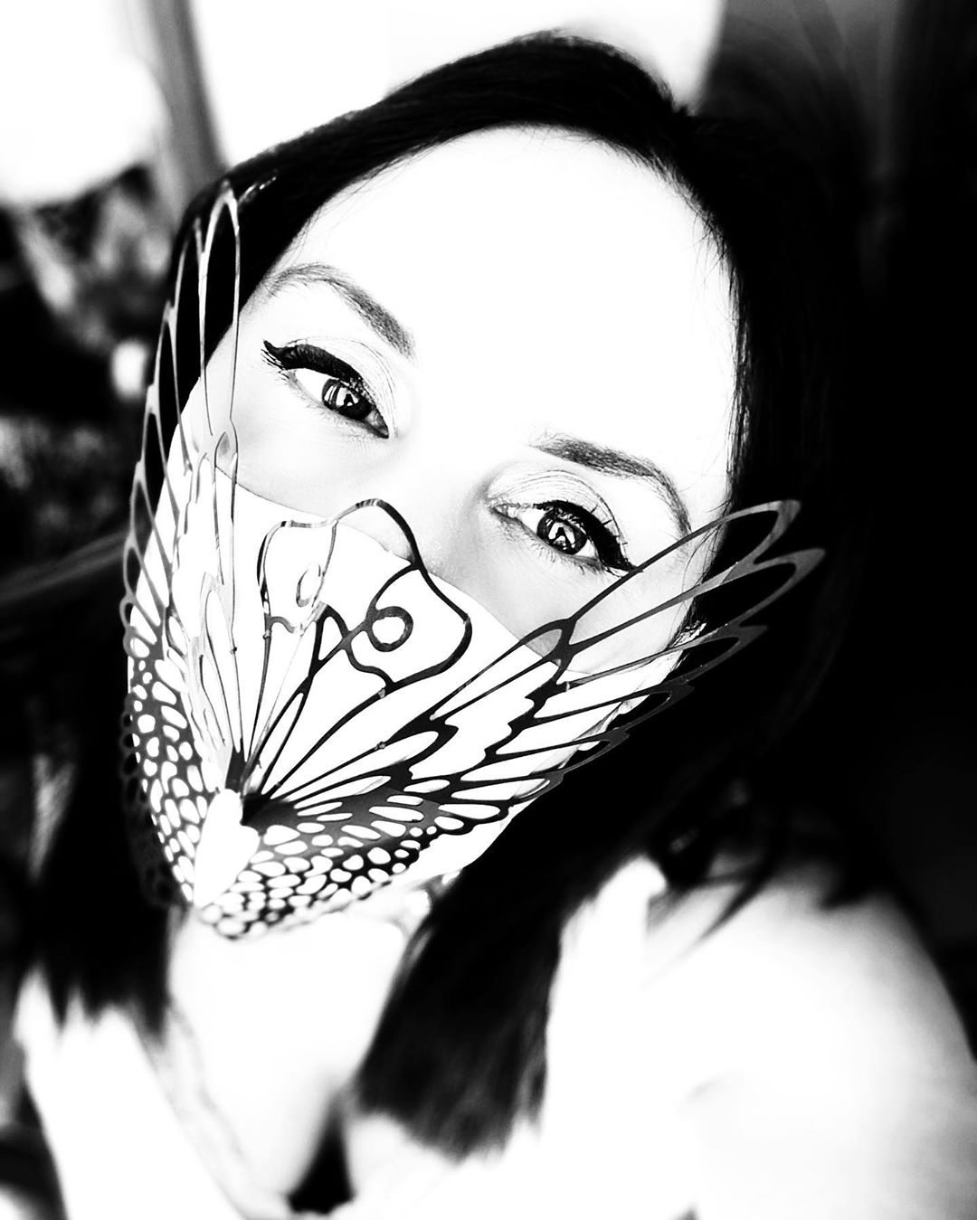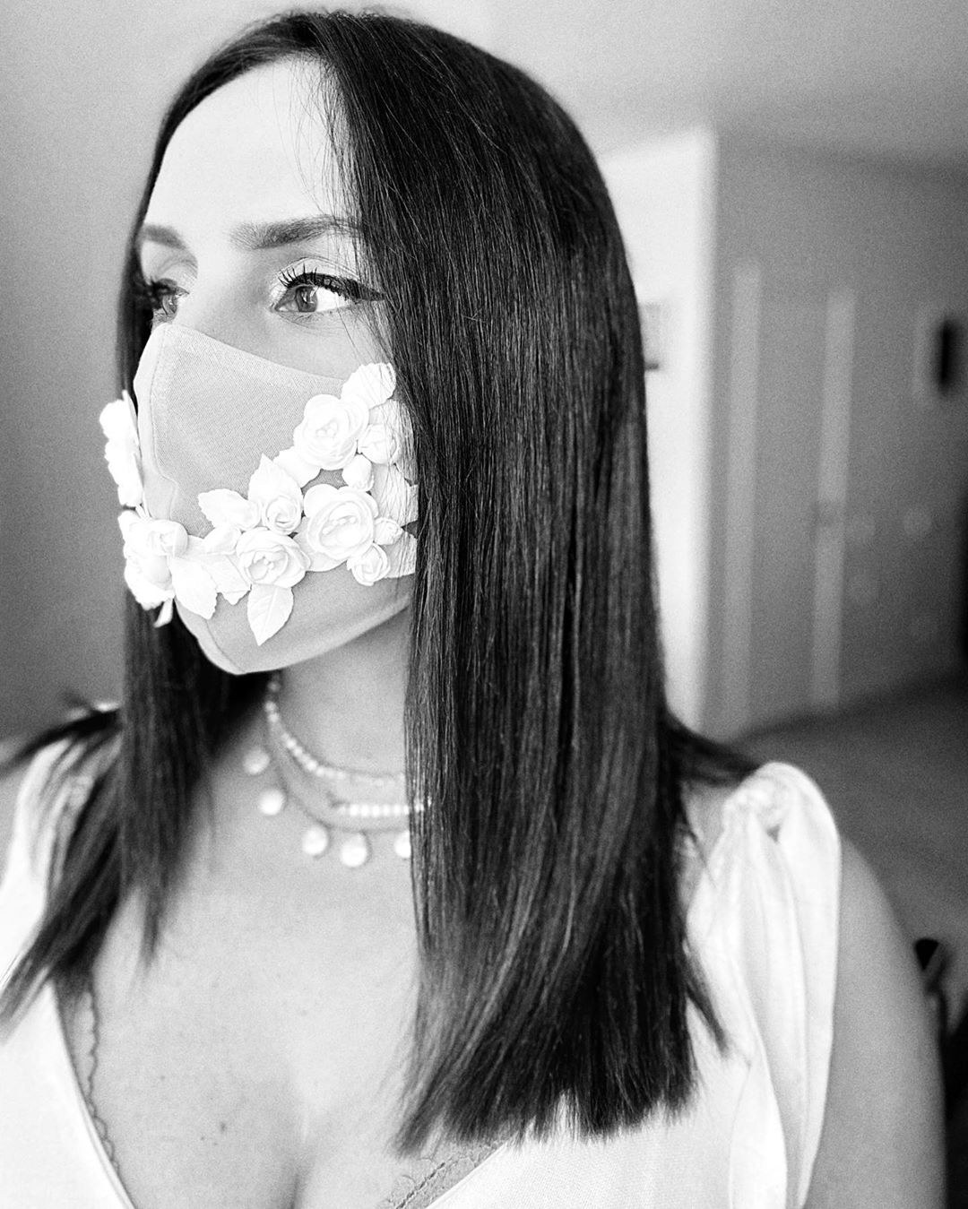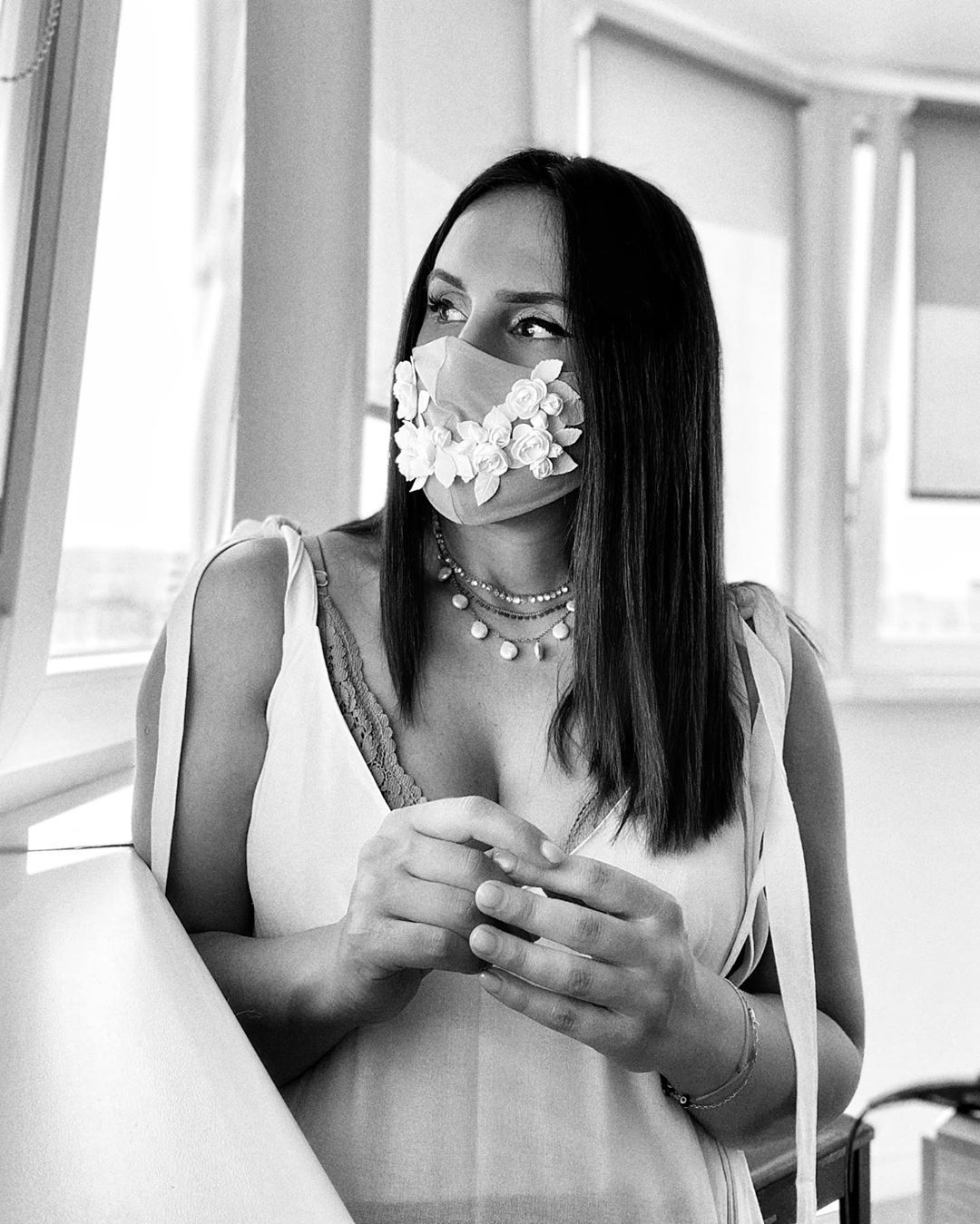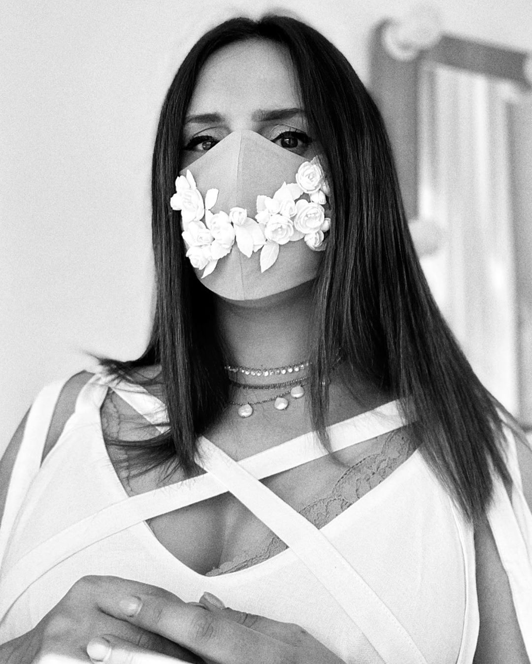 На своїй сторінці в Instagram вагітна зірка опублікувала серію чорно-білих знімків, на яких демонструє креативні маски для обличчя - розшиту квітами і в формі метелика. Автором першого аксесуара виступила художниця по костюмах Леся Патока, а друга маска - від українського бренду Nagolovy.