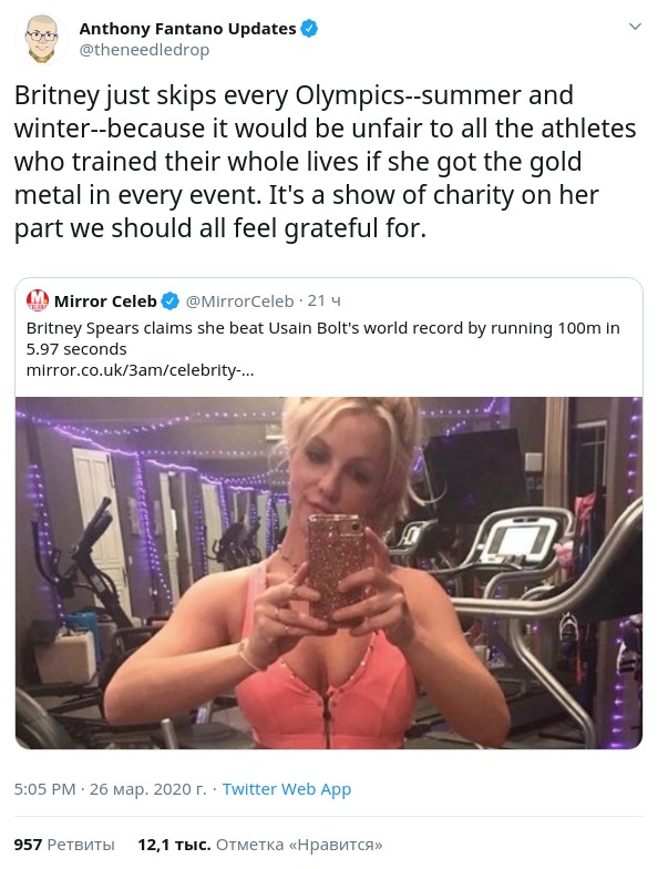 Брітні Спірс на карантині не втомлюється радувати фанатів потужними заявами. Після публікації комуністичних закликів перерозподіляти багатство, поп-співачка написала в Instagram, що пробігла 100 метрів за 5,97 секунд. Це на 4 секунди швидше, ніж світовий рекорд Усейна Болта, який в 2009 році пробіг аналогічну дистанцію за 9,58 секунд.