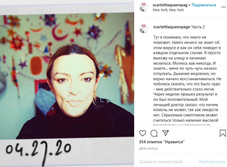 "Тут я розумію, що ніхто не допоможе. Ніхто нічого не знає про цей вірус і як він себе поведе в кожному окремому випадку. Я просто виходжу на вулицю і починаю молитися. Молюсь як ніколи. І знаєте ... мене потрошку стало відпускати. Дихання повільно, але вірно почало відновлюватися. Не побоюся сказати, що це було чудо - мені дійсно стало легше", - поділилася трансспівачка.