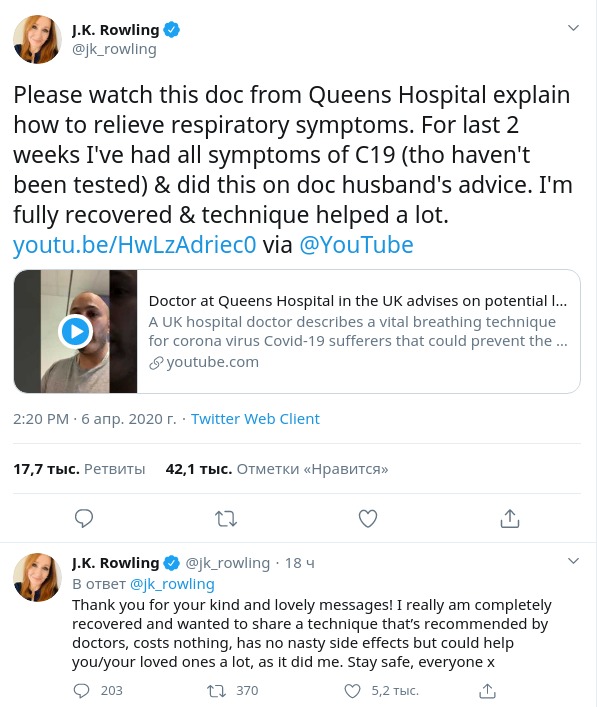 "Протягом останніх двох тижнів у мене були всі симптоми Covid-19 (не перевірялася), і я робила ці [дихальні вправи] за порадою чоловіка-лікаря. Я повністю одужала, і техніка дуже мені допомогла", - написала Джоан в Twitter, поділившись відео, на якому лікар лондонській Королівській лікарні дає інструкцію щодо полегшення симптомів коронавірусу.