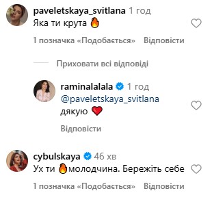 У коментарях до її допису свій захват висловили партнерка колишнього міністра закордонних справ України Дмитра Кулеби Світлана Павелецька та співачка Ольга Цибульска.