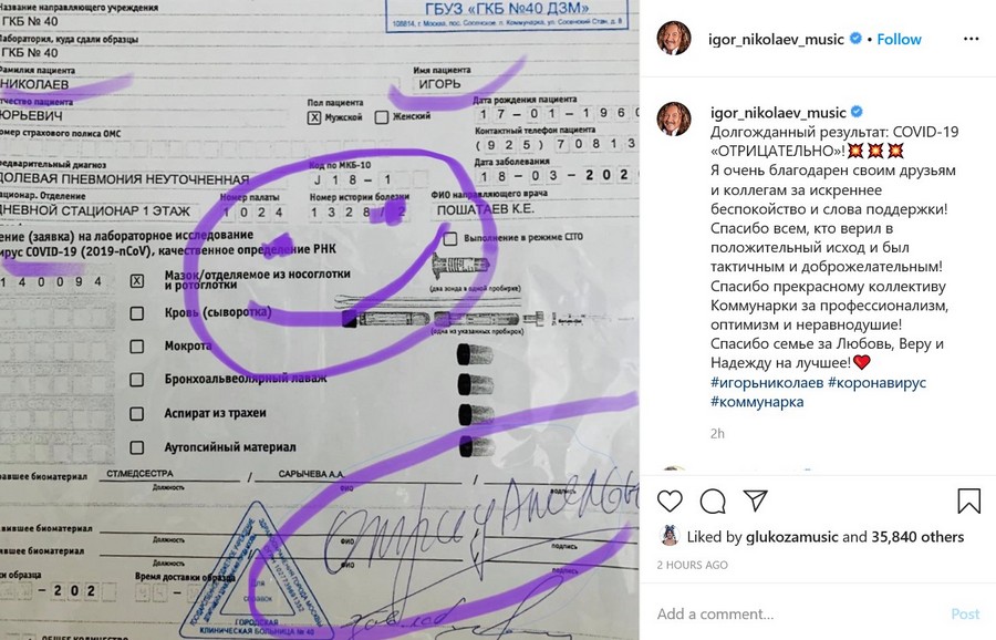 Госпіталізований раніше в одну з клінік Москви співак Ігор Ніколаєв опублікував в мережі результати тесту на коронавірус. Незважаючи на схожі симптоми, тест виявився негативним, чим артист охоче поділився з підписниками в Інстаграм.
