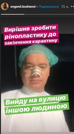 Причиною поширення чуток стало свіже фото гумориста в його Інстаграм-сторіз. На ньому Кошовий зображений в медичній шапочці, а його ніс закритий бинтом і пластирами. "Вирішив зробити ринопластику до закінчення карантину. Вийду на вулицю іншою людиною", - написав він у своєму пості.