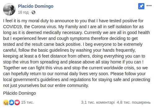 Іншою відомою особою, у якої діагностували коронавірус, виявився оперний співак Пласідо Домінго. "Я вважаю своїм моральним обов'язком оголосити вам, що у мене позитивний результат", - написав у Facebook 79-річний іспанець.