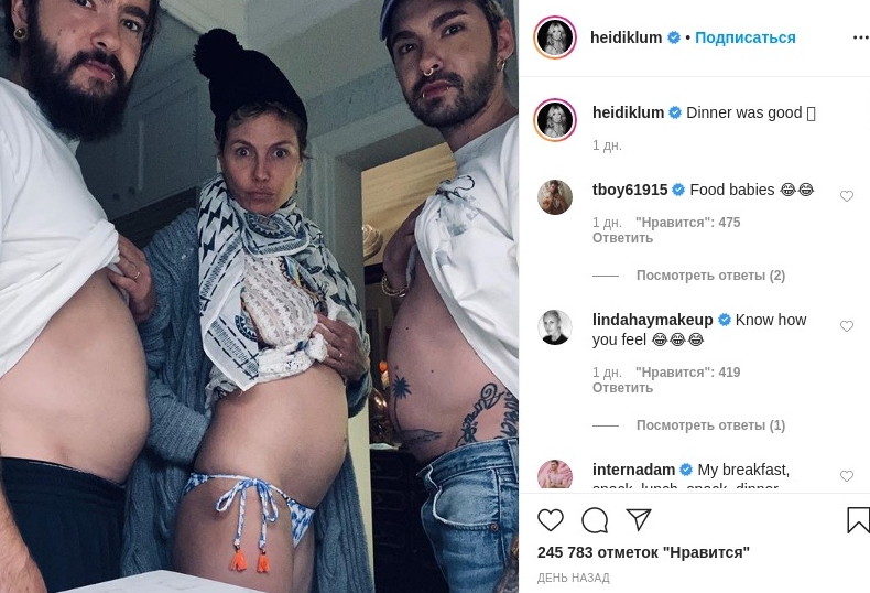 46-річна Хайді Клум з гумором ставиться до свого статусу супермоделі, тому публікує чесні фотографії, які більшість із нас поспішили б видалити. Так, німецька красуня показала в Instagram післяобіднє фото з молодим чоловіком Томом Каулітцем і його братом Біллом.