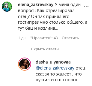 Даша не стала приховувати, що батько був, м'яко кажучи, не в захваті. "Батько сказав, що шкодує, що пустив його на поріг", - відповіла дівчина.