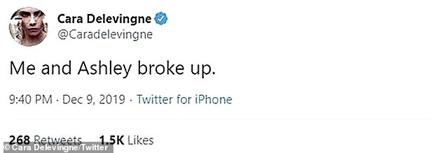 "Ми з Ешлі розлучилися", - написала "Кара" в Twitter про актрису, з якою зустрічається з травня 2018 року.