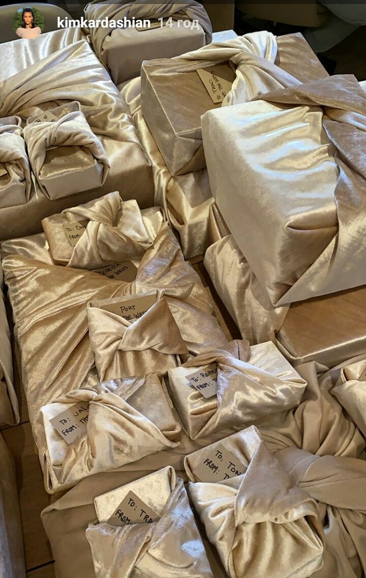 На її фото красується купа коробок, загорнутих в оксамитову тканину бежевого кольору. У Instagram-сторіс Кім пояснила, що це щорічна традиція, коли кожен член родини "обирає колір і атмосферу", щоб обернути свої подарунки і показати всім, від кого вони.