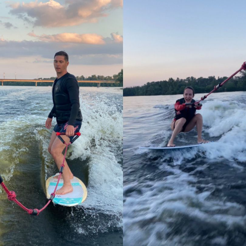 "Ще їздили в Межигір'ї кататися на електробайках. Нещодавно відкрили для себе вейксерф в школі City Swell. Вова вже встав на дошку, а я ось як раз на цих вихідних вперше спробувала - кайф нереальний! Мені було дуже складно, так як я ніколи не пробувала такі види спорту, але я однозначно повернуся! І встану на цей серф, я ж з тих, хто не здається", - зазначила обраниця ведучого.