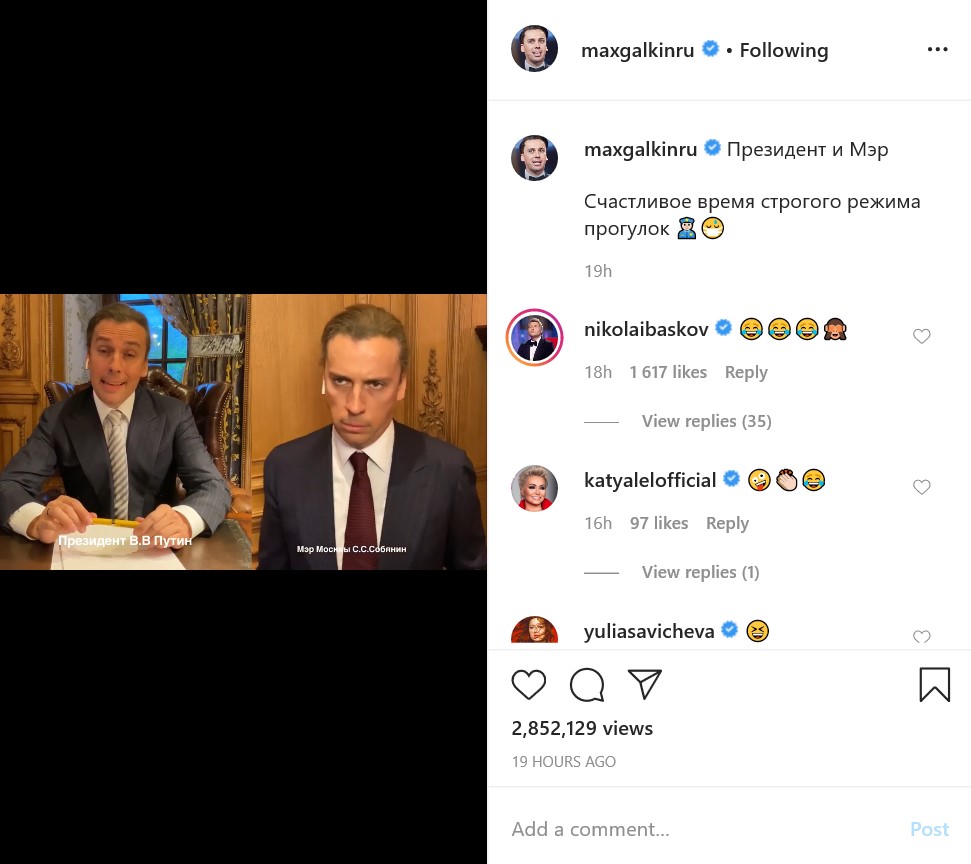 На особистій сторінці в Інстаграм Максим Галкін опублікував 5-хвилинне відео з підписом "Щасливий час суворого режиму прогулянок". У ньому чоловік співачки Алли Пугачової спародіював і президента РФ, і мера Москви, які раніше провели онлайн-нараду і обговорили запропоновані Собяніним правила прогулянки в Москві за графіком.