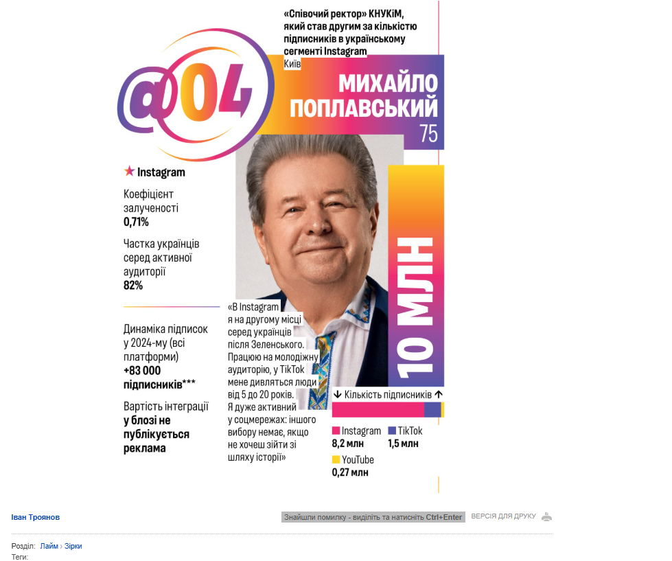 У свіжому журналі Forbes опубліковано рейтинг Топ-20 інфлюенсерів України, 4-те місце cеред найвпливовіших блогерів України посів Михайло Поплавський з сукупною аудиторією у ТikТok, Instagram та YouTube у 10 млн підписників.