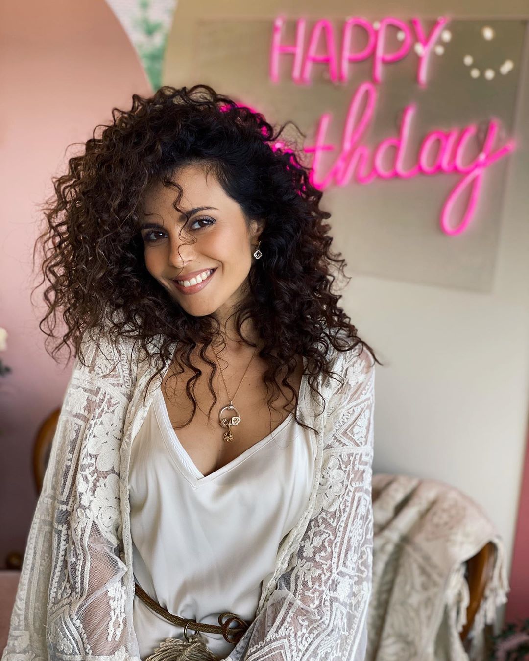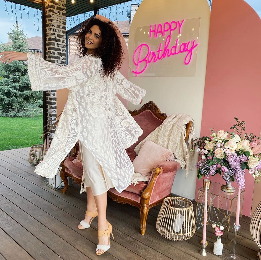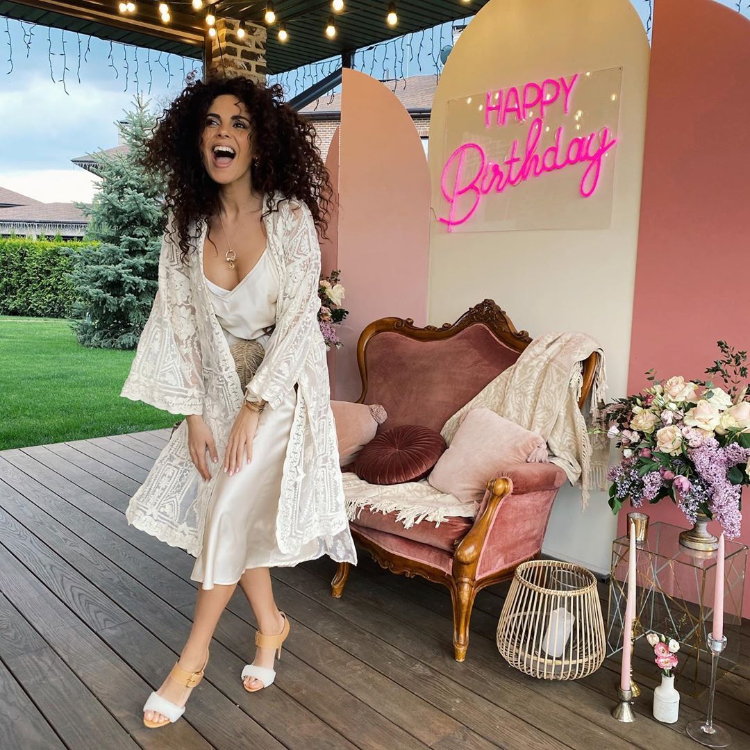 Кілька знімків з домашнього святкування NK опублікувала на особистій сторінці в Instagram. Для зустрічі знаменної дати Настя обрала ніжний образ: шовкову спідницю нюдового відтінку, молочний топ і мереживну накидку. Свій святковий образ артистка доповнила трендової зачіскою - дрібними кучерями в стилі афро.