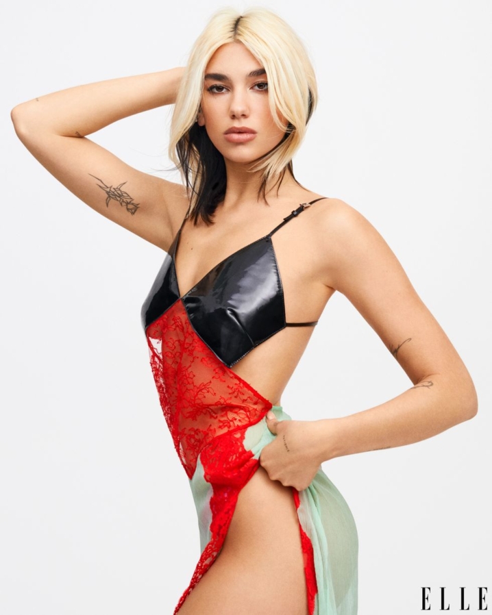 На інших знімках Дуа Ліпа демонструє завидну фігуру в прозорій сукні Gucci, жакеті Saint Laurent, яскравому вбранні від Марка Джейкобса і знаменитому лаковом нагруднику від Тома Форда, який раніше носили актриси Зендая і Гвінет Пелтроу.