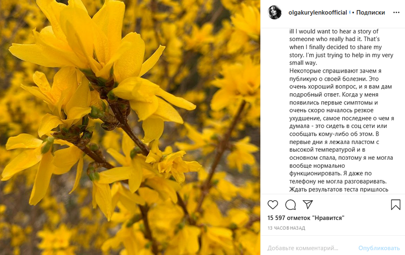 "Дівчина Бонда" написала в Instagram новий пост, в якому дала відповідь на це питання. За словами Ольги, спочатку вона не хотіла заявляти публічно, що підхопила COVID-19. Однак на цьому наполягли її друзі.
