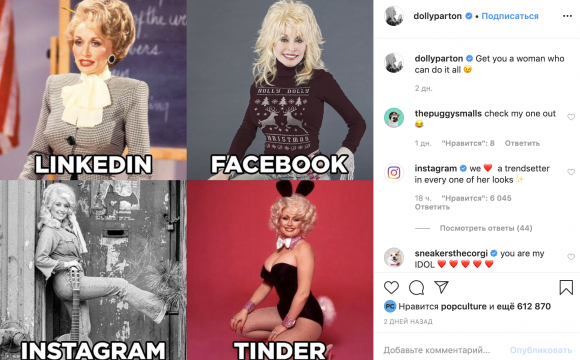 Початок цьому челенджу поклала 74-річна американська "королева кантрі" - співачка Доллі Партон, опублікувавши колаж з чотирьох знімків на своїй Instagram-сторінці.
