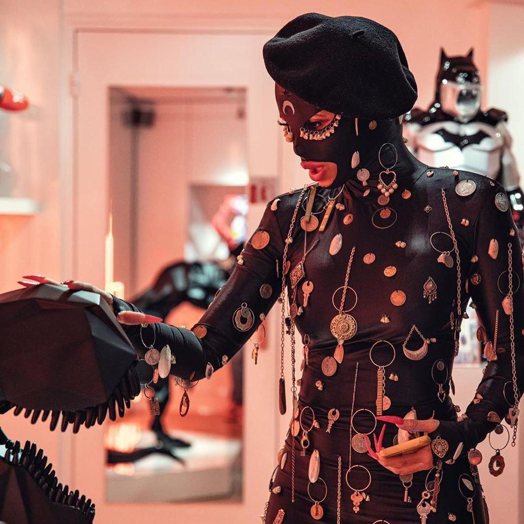 Лук другого дня був закритою чорною сукнею до підлоги, яку доповнили берет і знову маска, яка приховувала обличчя зірки. Головними елементами епатажного вбрання Карді стали дзвінкі ключі.