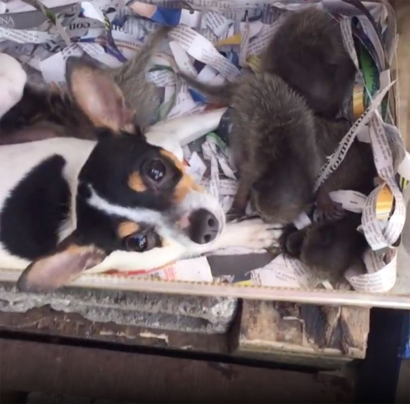 Четверо новонароджених єнотів з Сан-Хосе (Коста-Ріка) трагічно втратили рідну матір, але тут же отримали люблячу мачуху в особі маленької собаки породи рет-тер'єр. Зворушлива історія з'явилася в соціальних мережах каналу ViralHog.