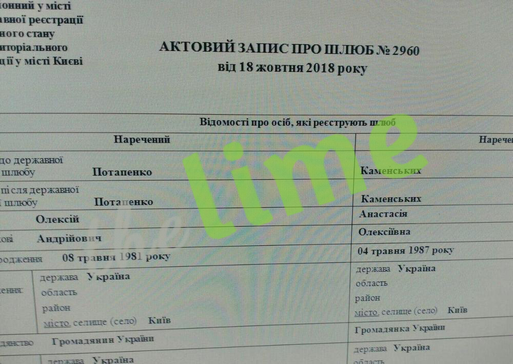 У розпорядженні the Lime опинився документ, згідно з яким закохані одружилися майже рік тому, а саме - 18 жовтня 2018 року. Потап і Настя Каменських кілька років приховували свої відносини. Артисти зіграли весілля 23 травня 2019 року, а до цього часу відмовлялися навіть коментувати чутки про свій роман.