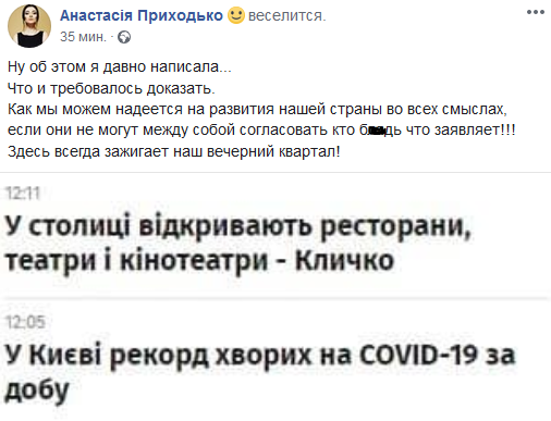 На своїй сторінці у Facebook артистка написала пост, в якому різко прокоментувала дві важливі новини середи. Свою публікацію вона супроводила скриншотами двох заголовків: "У Києві рекорд хворих на Covid-19 за добу" і "В столиці відкривають ресторани, театри і кінотеатри, - Кличко".